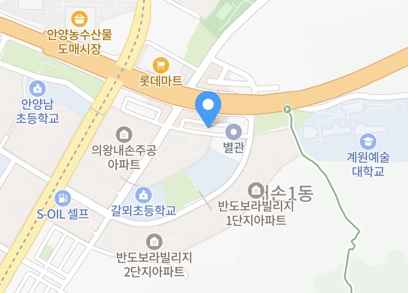 * 서울외곽순환고속도로 이용시 평촌IC에서 '안양, 평촌' 방면으로 우측 고속도로 출구 - 롯 데마트사거리에서 우회전 - 갈미1로를 따라 90m이동 - 좌 회전 - 갈미2로 132m이동
